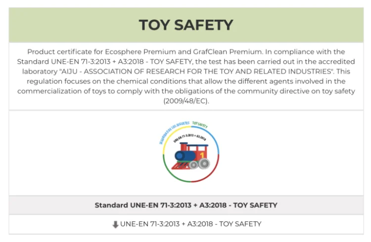 Graphenstone is pleased to announce that we have obtained a new product certificate for Ecosphere Premium and GrafClean Premium. In compliance with the standard UNE-EN 71-3:2013 + A3:2018 – TOY SAFETY, the test has been carried out in the accredited laboratory “AIJU – ASSOCIATION OF RESEARCH FOR THE TOY AND RELATED INDUSTRIES”.