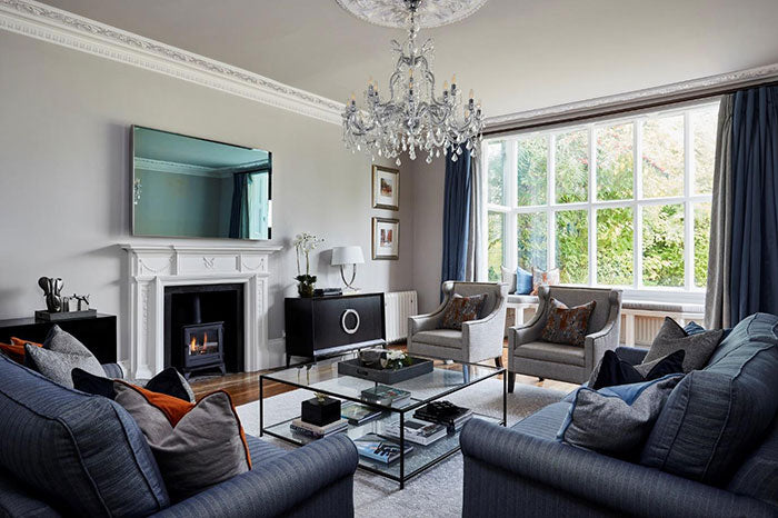 Start by drawing out your space including sockets and lights. Think about how you will utilise the space first and plan your furniture layout. Then look at lighting and think about the variety of light in the room which should be on different levels, so not all provided by ceiling light, but think about adding table lamps, cabinetry lighting or even small lights at floor level.