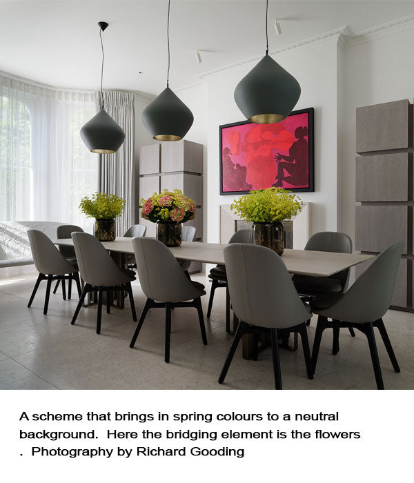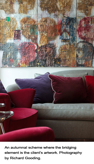 We also like to think about colours in terms of seasons. Monique was very inspired by her lecturer at Inchbald, Nico Springman. He saw colours and harder materials in terms of seasons that went together. A rich walnut wood floor lends itself to an autumnal palette of deep aubergines, russet reds and burnt orange. If you wanted to add a blue here it would be navy, rather than an acqua. That colour would sit in Spring.